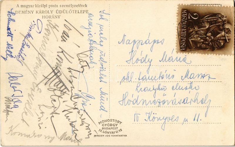1938 Horány (Szigetmonostor), Magyar Királyi Posta személyzetének &quo... https://www.darabanth.com/hu/358-Gyorsarveres/358.0/Kepeslapok/Magyarorszag~1000004/1938-Horany-Szigetmonostor-Magyar-Kiralyi-Posta-szemelyzetenek-Demeny-Karoly-udulotele~II1983874