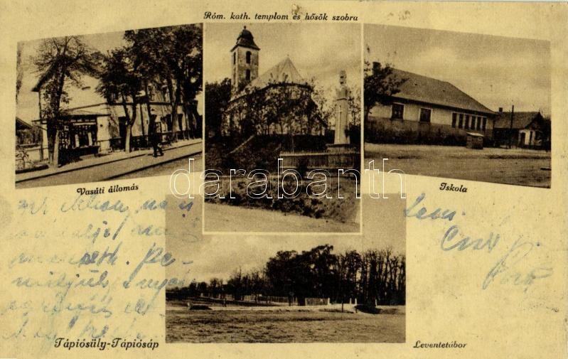 Leírás: 1944 Tápiósüly-Tápiósáp (Sülysáp), Római katolikus templom és hősök szobra, emlékmű, Iskola, Leventetábor, Vasútállomás (fl)