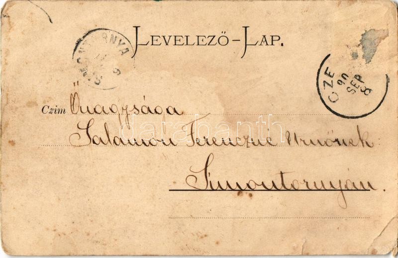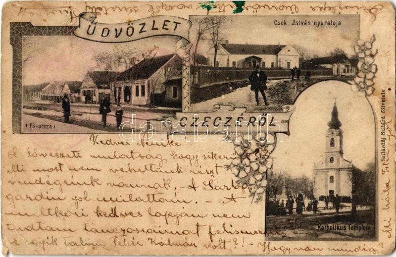 ~1900 Cece, Czecze; Fő utca, üzlet, Katolikus templom, Csók István nyaralója, Csók kastély. Szilárdfij Szilárd felvétele. Art Nouveau, floral (kopott sarkak / worn corners)