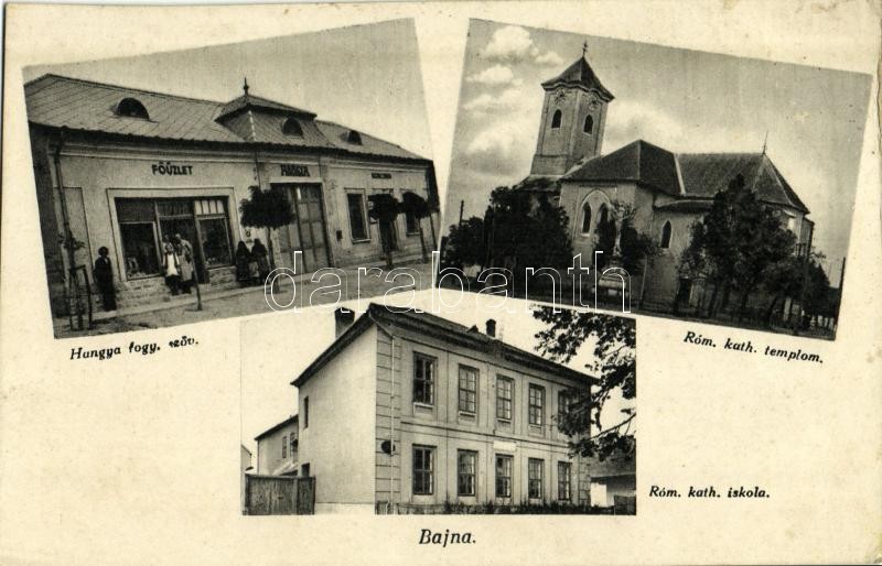 Leírás: Bajna, Római katolikus templom és iskola, Hangya fogyasztási szövetkezet üzlete és saját kiadása (EK)