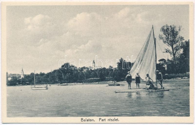 Leírás: Balaton, part, csónakázók, deszka vitorlás. Kiadja a Pongrácz áruház