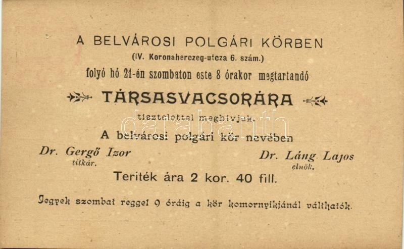 Leírás: Budapest V. A Belvárosi Polgári Kör meghívója társasvacsorára. Koronaherceg utca 6.
