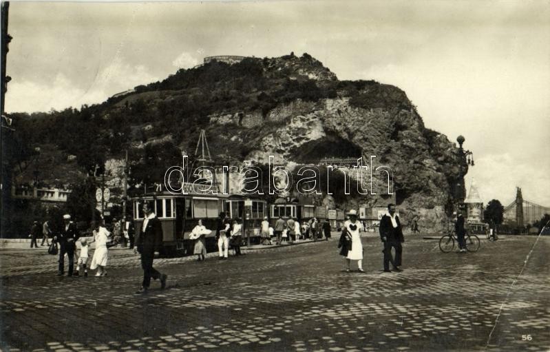 Leírás: Budapest XI. Gellérthegy, Citadella és Barlangkápolna, villamos Gschwindt likőrök és konzervek reklámmal (EB)