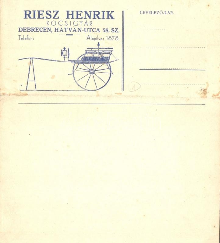 Debrecen, Hatvan utca 58. Riesz Henrik kocsigyárának reklámlapja (EK) https://www.darabanth.com/hu/358-Gyorsarveres/358.0/Kepeslapok/Magyarorszag~1000004/Debrecen-Hatvan-utca-58-Riesz-Henrik-kocsigyaranak-reklamlapja-EK~II1595976