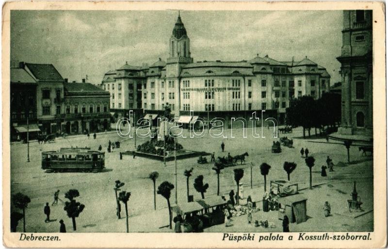 Leírás: Debrecen, Püspöki palota a Kossuth szoborral, villamos, Első Magyar Általános Biztosító Takarék főügynöksége, üzletek (EK)