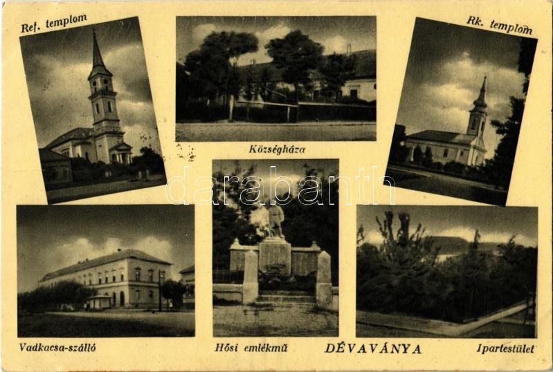 Leírás: Dévaványa, Vadkacsa szálloda, Református templom, Községháza, Római katolikus templom, Hősök szobra, emlékmű, Ipartestület