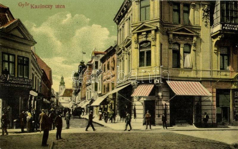 Győr, Kazinczy utca, Első Győri Gőzerővel Berendezett selyem és kelme festészeti és vegyészeti tisztító intézet, Szabó és Társa üzlete, fényképészeti műterem (Rb)