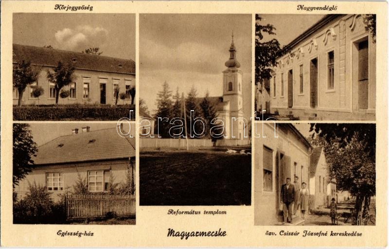 Leírás: Magyarmecske, Körjegyzőség, Református templom, Nagyvendéglő, étterem, Egészség ház, Özv. Csiszár Józsefné üzlete, kerékpár