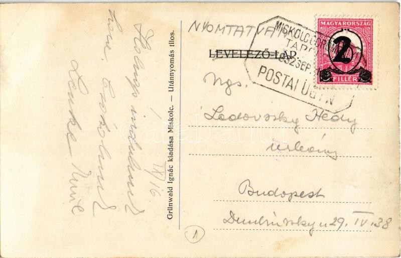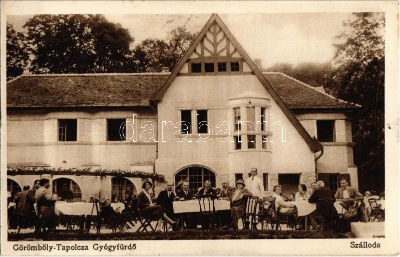 Leírás: Miskolctapolca, Görömbölytapolca, Görömbölyi-Tapolca, Tapolca (Miskolc); Szálloda és étterem, terasz vendégekkel és pincérrel. Kiadja Grünwald Ignác + 1932 Miskolc-Görömbölyi Tapolca pü. pecsét (EK)