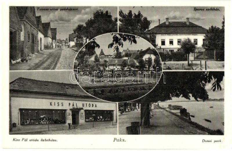 Leírás: Paks, Erzsébet sétatér, uszoda, Iparos székház, Tavasz utcai présházsor, Kiss Pál utóda üzlete és saját kiadása