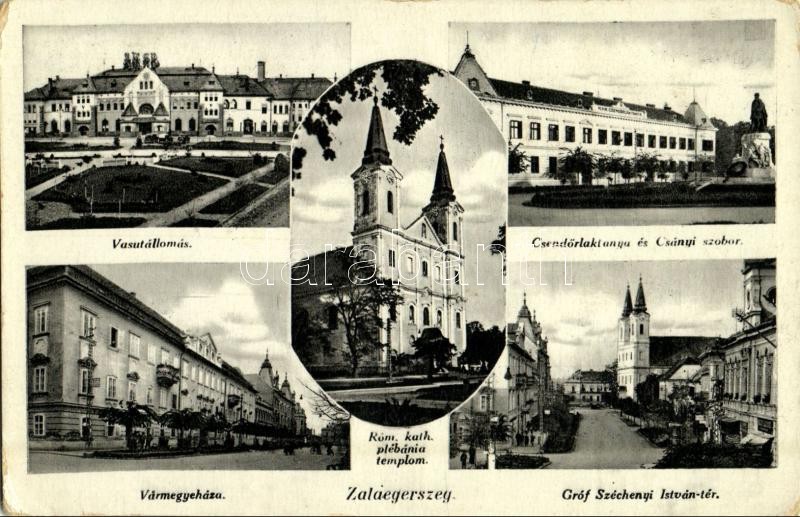 Zalaegerszeg, Vasútállomás, Csendőrlaktanya és Csányi szobor, Római katolikus plébániatemplom, Vármegyeháza, Gróf Széchenyi István tér. Kiadja Szabó György cserkészboltja (EK)