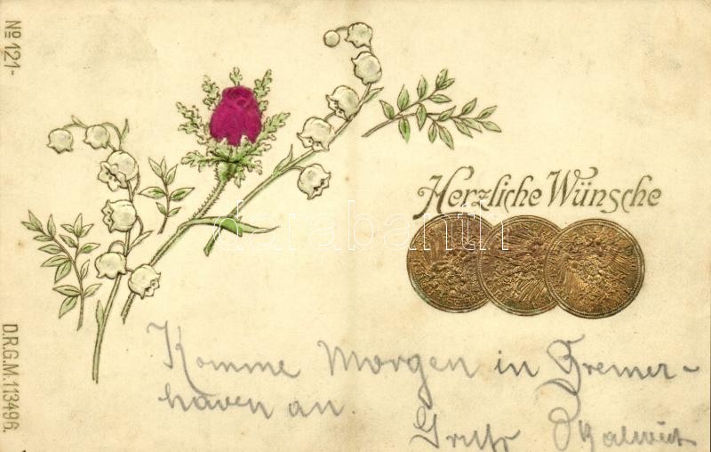 Leírás: 1900 Herzliche Wünsche. Deutsche Reich 10 Mark / Coins of Germany. Greeting with flower, silk card. DRGM 113496. No. 121. Emb.