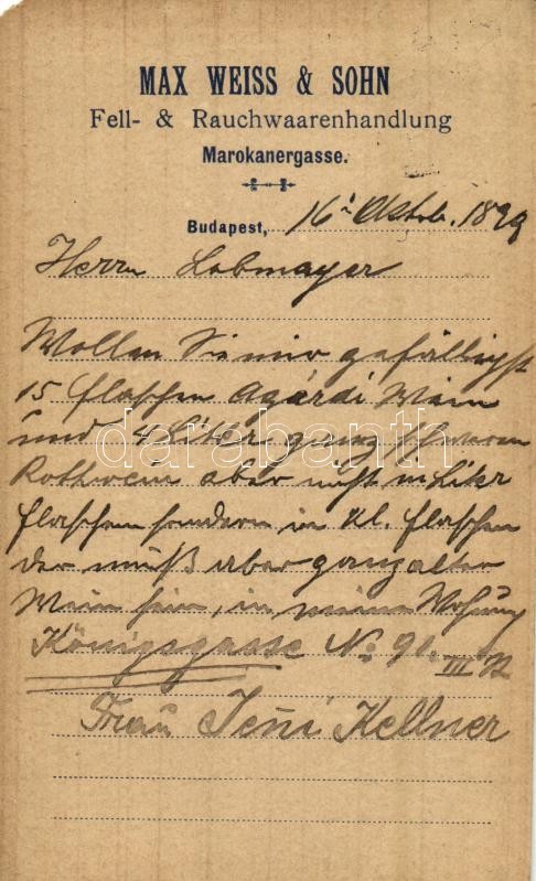 1899 Max Weiss & Sohn Fell- & Rauchenwaarenhandlung Marokanergasse / Weisz Miksa és fia bőr és szőrmeáru raktára reklámlapja. Budapest V. Marokkai utca / Hungarian leather and fur warehouse and shop advertisement card (EM)