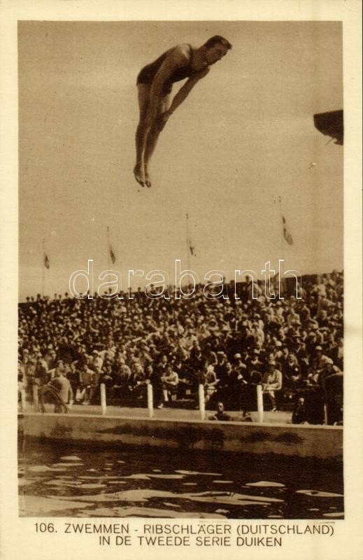 1928 Amsterdam, Olympische Spelen. Zwemmen, Ribschläger (Duitschland) in de tweede serie duiken / 1928 Summer Olympics. Swimming, Ribschläger (Germany) in the second series of dives