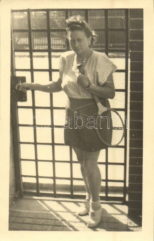 Hölgy teniszütővel / Lady with tennis racket. photo https://www.darabanth.com/hu/358-Gyorsarveres/358.0/Kepeslapok/Sport~1000079/Holgy-teniszutovel-Lady-with-tennis-racket-photo~II2058000