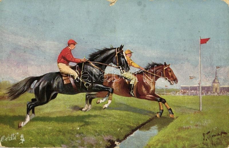 Leírás: Horse jumping obstacles. Raphael Tuck & Sons Oilette "Hindernisrennen" Der erste Graben. Series No. 579. (tear)