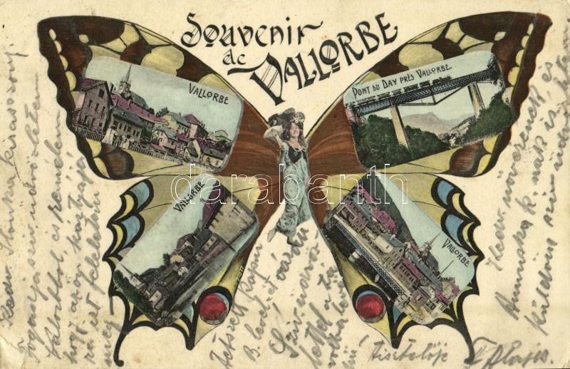 Leírás: 1905 Vallorbe, Souvenir, Pont du Day / railway bridge. Art Nouveau montage postcard with butterfly lady (EK)