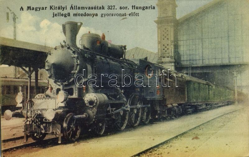 A Magyar Királyi Államvasutak (MÁV) 327. sor. Hungaria jellegű mozdonya gyorsvonat előtt. A Gőzmozdony felvétele és kiadása 627. / Hungarian State Railways locomotive (EK)