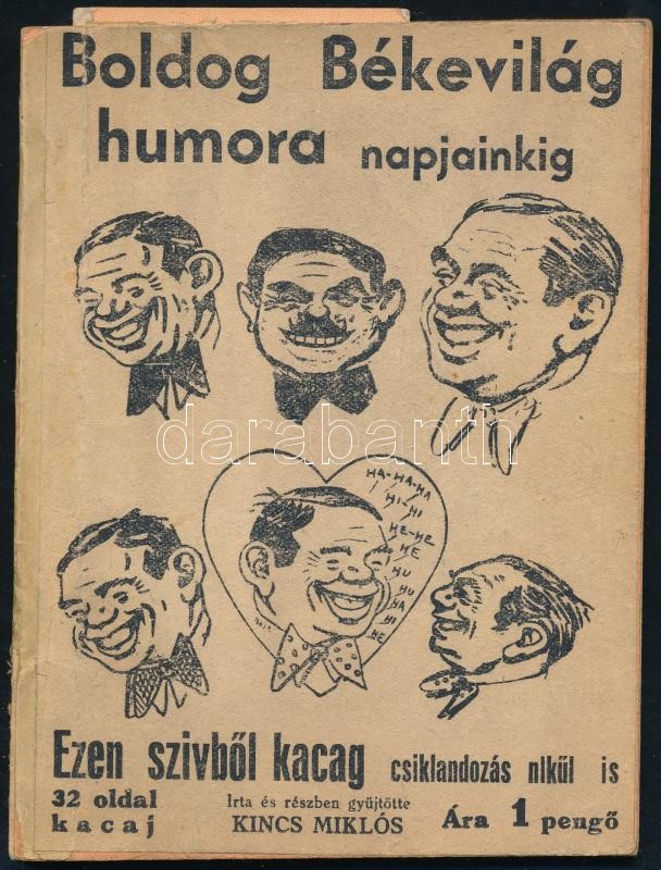 Leírás: Kincs Miklós: Boldog békevilág humora napjainkig. Bp., én., Szentes-nyomda. Kiadói papírkötés, kissé sérült gerinccel.