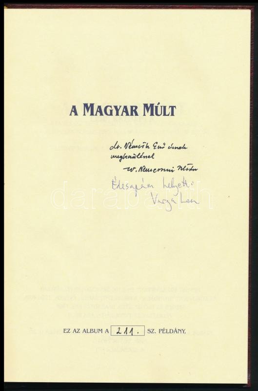 Számozott (400/211.) példány. A történelmi fejezetek írójának Wodianer-Nemessuri Zoltánnak és az illusztrátor fiának dedikációjával.