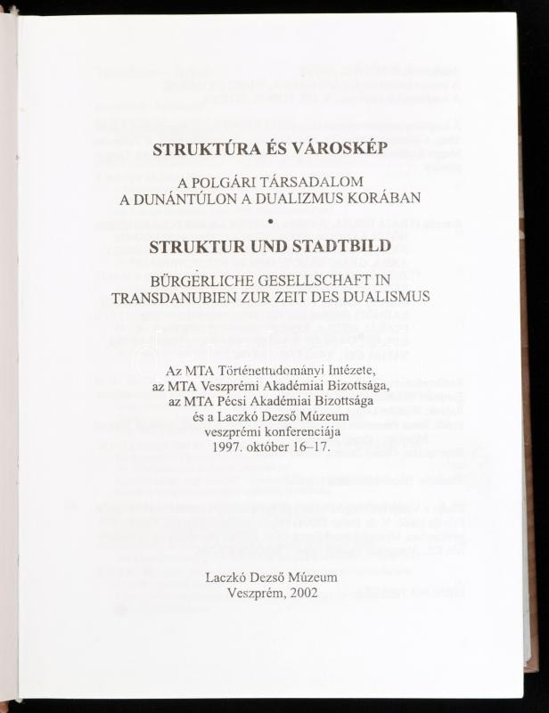 Struktúra és városkép. A polgári társadalom a Dunántúlon a dualizmus korában. Az MTA Történettudományi Intézete, az MTA Veszprémi Akadémiai Bizottsága, az MTA Pécsi Akadémiai Bizottsága, és a Laczkó Dezső Múzeum veszprémi konferenciája, 1997. okt. 16.-17. Veszprém, 2002, Laczkó Dezső. Magyar és német nyelven. Kiadói kartonált papírkötés.