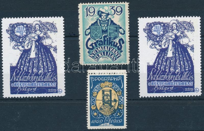 Leírás: 1919-2010 4 db reklámbélyeg, Tipográfiai, grafikai kiállítás levélzáró