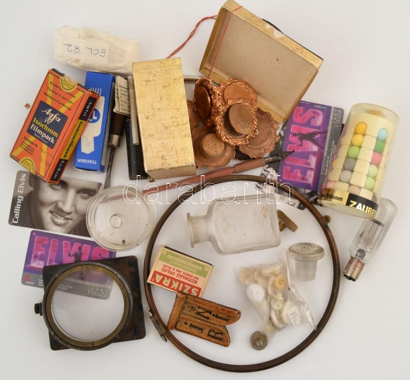 Leírás: Egy doboznyi vegyes apróság: gyógyszertári üveg, játékok, Szikra gyújtó, lencse, gombok.