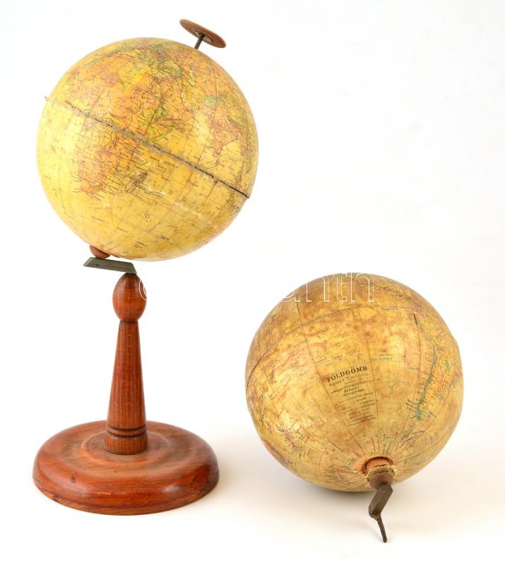 Leírás: Háború előtti földgömbök (Földrajzi Intézet), egyik állvány nélkül d:19 cm.