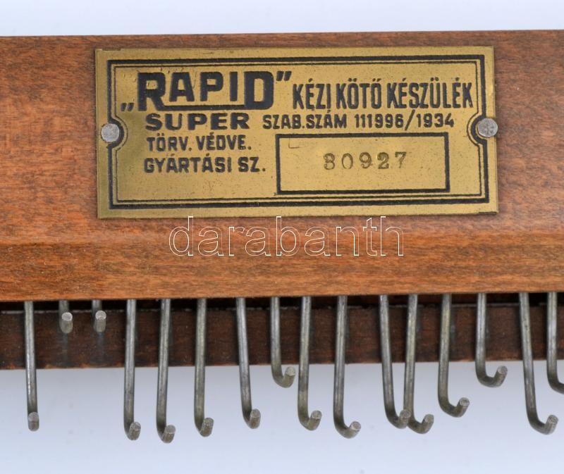 Rapid Super kézi kötőkészülék, dobozban, h: 73 cm.+ Fém-fa állvány, 37... https://www.darabanth.com/hu/358-Gyorsarveres/358.0/Mutargy-papirregiseg-egyeb/Bolhapiac~500011/Rapid-Super-kezi-kotokeszulek-dobozban-h-73-cmplus-Fem-fa-allvany-37x12-cm~II2059546