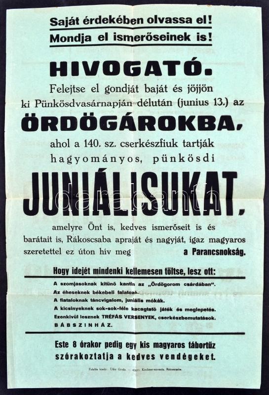 Leírás: cca 1930 Rákoscsaba, 140. sz. cserkészfiú csapat pünkösdi juniálisának meghívó plakátja. Rákoscsaba, Kirchner-ny., hajtásnyomokkal, 47x31 cm.
