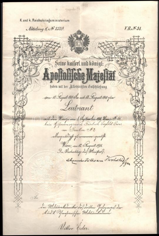 1911 Díszes hadnagyi kinevezés Éder Győző (1890-1980) cs. és kir. huszártiszt, a brassói cs. és kir. 2. huszárezred tagja részére, Alexander von Krobatin (1849-1933) táborszernagy, későbbi hadügyminiszter (1912-1917) aláírásával, szárazpecséttel.