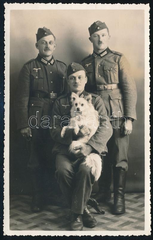 cca 1940 Német katonák kutyával, fotólap, 13,5×8,5 cm https://www.darabanth.com/hu/358-Gyorsarveres/358.0/Mutargy-papirregiseg-egyeb/Militaria~500029/cca-1940-Nemet-katonak-kutyaval-fotolap-13-5C3978-5-cm~II2060319