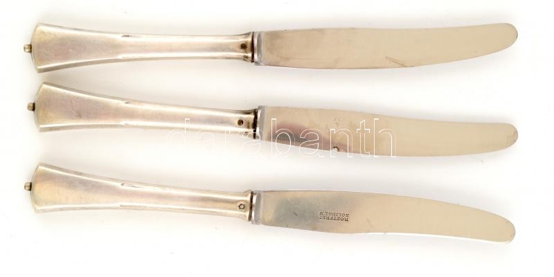 Leírás: 3 db ezüst (Ag) nyelű kés, jelzett, sérüléssel, h: 22 cm