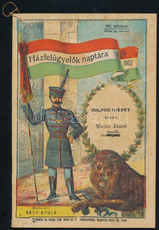 1907 Házfelügyelők naptára. Szer Váry Gyula. Moósz János. Jó állapotba... https://www.darabanth.com/hu/358-Gyorsarveres/358.0/Mutargy-papirregiseg-egyeb/Nyomtatvanyok~500034/1907-Hazfelugyelok-naptara-Szer-Vary-Gyula-Moosz-Janos-Jo-allapotban~II2057286