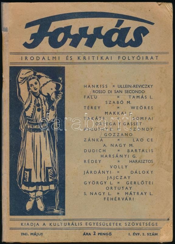 1942 A Forrás c. folyóirat I. évf 5. szám. https://www.darabanth.com/hu/358-Gyorsarveres/358.0/Mutargy-papirregiseg-egyeb/Nyomtatvanyok~500034/1942-A-Forras-c-folyoirat-I-evf-5-szam~II2039401