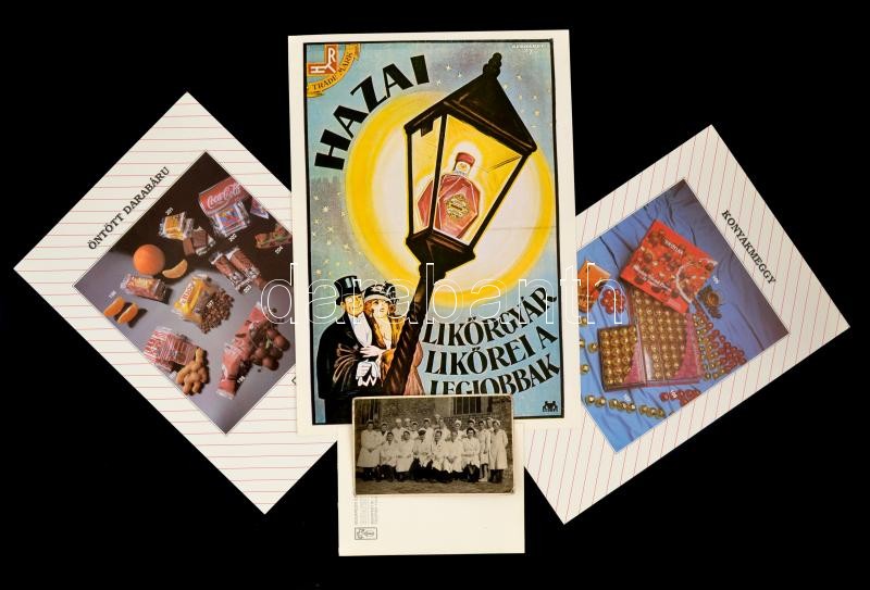 cca 1948-1979 Vegyes nyomtatvány tétel, 5 db, közte öntött darabáru, konyakmegy, Hazai likÅ‘r reklám (reprint), Édesipari vállalat fejléces papÃrja, Dreher Keksz gyár dolgozóinak 1948. máj. 1. fotója (8x13 cm.)