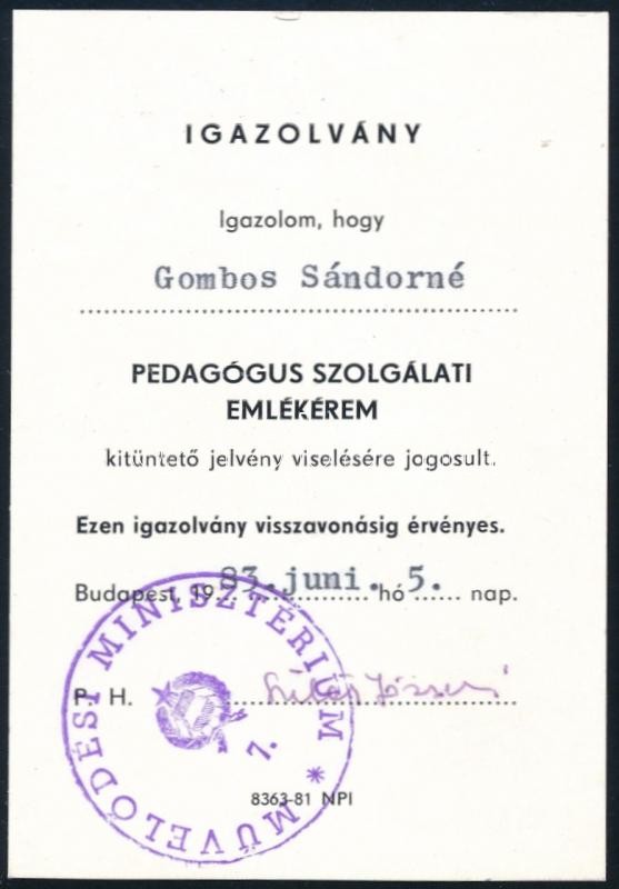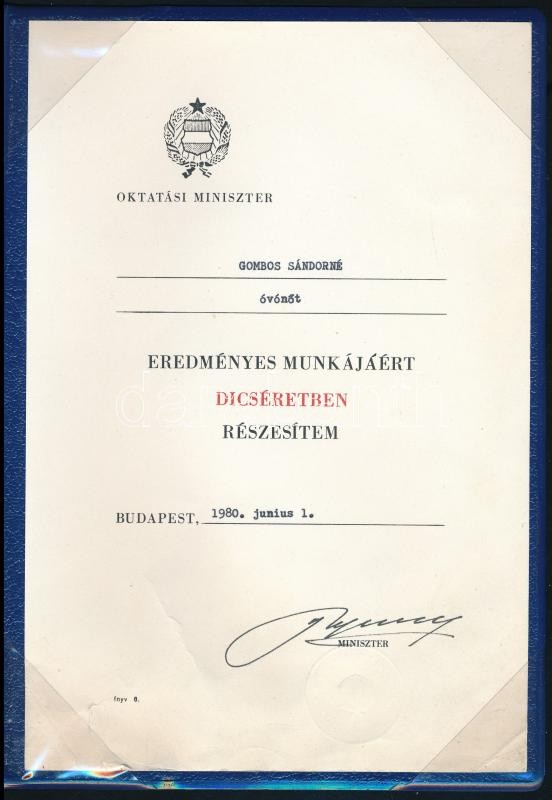 Leírás: 1980, 1983 Oktatásban nyújtott szolgálatért adományozott kitüntetések, 2 db oklevél