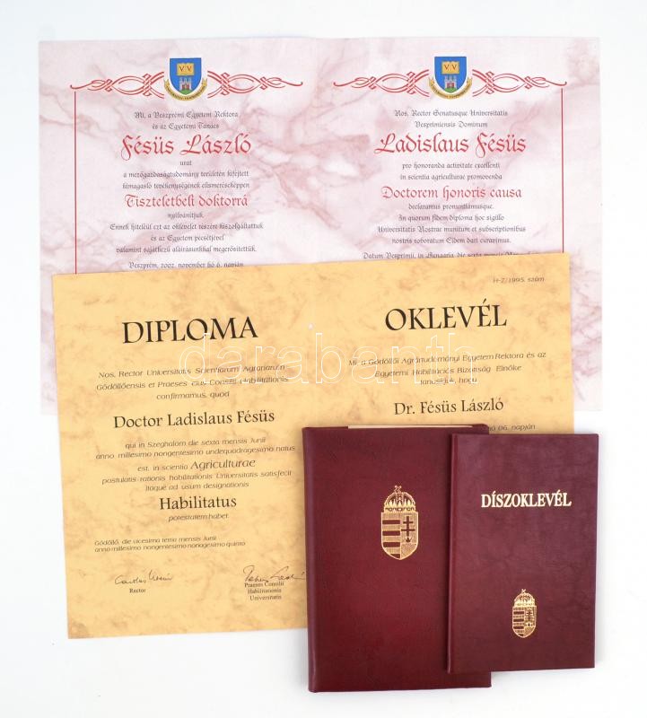 Leírás: cca 1990-2010 Állatorvosi aranydiploma, habilitációs oklevél, tiszteletbeli doktori oklevél, Professzori ösztöndíj oklevél