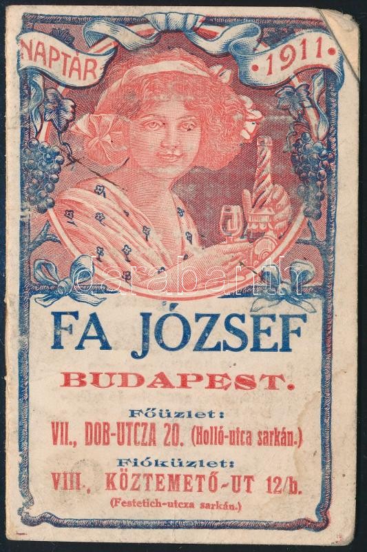 1911 Fa József italkereskedő reklámos zsebnaptára. 16p. Sarka sérült https://www.darabanth.com/hu/358-Gyorsarveres/358.0/Mutargy-papirregiseg-egyeb/Reklam~500023/1911-Fa-Jozsef-italkereskedo-reklamos-zsebnaptara-16p-Sarka-serult~II2057289