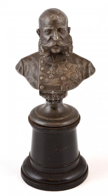 Leírás: Ferenc József-mellszobor, spiáter, jelzés nélkül, fa talapzaton, sérült, talapzattal m: 20 cm.