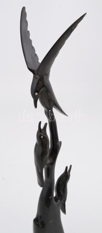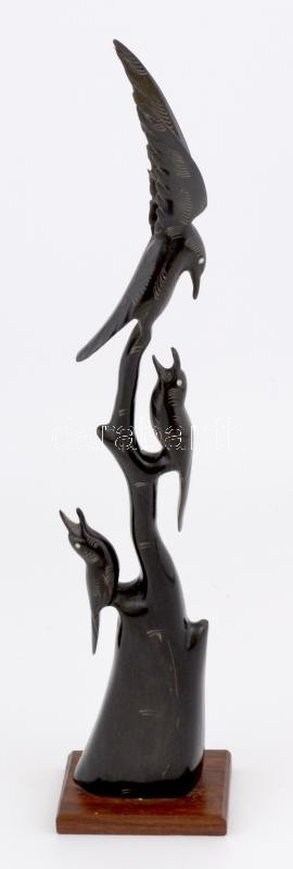 Leírás: Madár a fiókáival, szaruból faragott kisplasztika, fa talapzaton, jelzés nélkül, m:40 cm