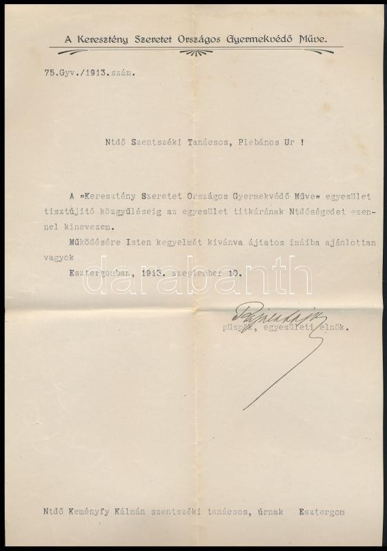 1913 Esztergom, A Keresztény Szeretet Országos Gyermekvédő Műve egyesület kinevezési okmánya Rayner Lajos (1842-1920) püspök, teológiai doktor, egyesületi elnök saját kezű aláírásával