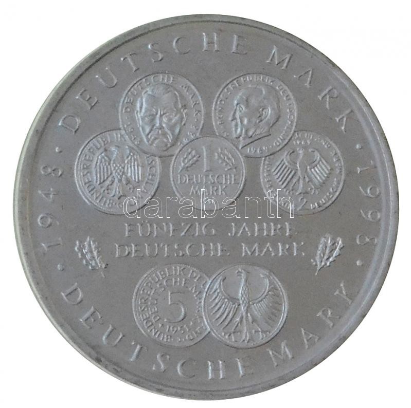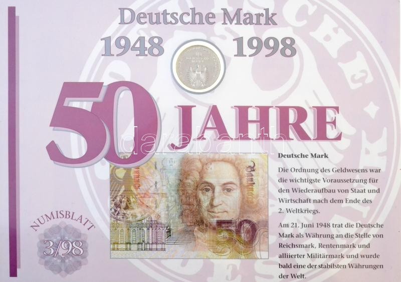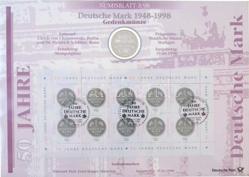 Németország 1998F 10M Ag "50 éves a Német Márka" nagyalakú emlékíven elsőnapi bélyegzős bélyeg-kisívvel T:1