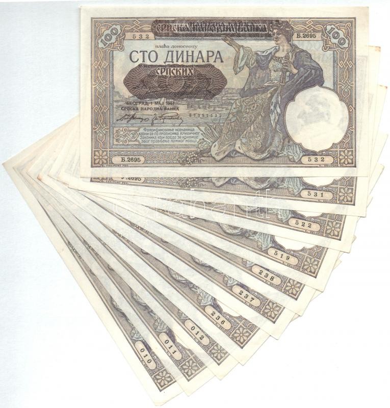 Yugoslavia 1941. 100 Dinara (10x) with pairs and three of sequential serials C:AU
