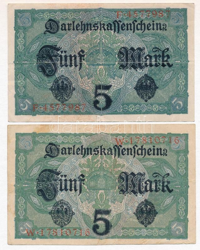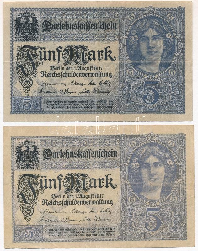 German Empire 1917. 5 Mark (2x) ... https://www.darabanth.com/hu/358-Gyorsarveres/358.0/Numizmatika/Kulfoldi-bankjegyek~2000012/Nemet-Birodalom-1917-5M-2x-TIII--German-Empire-1917-5-Mark-2x-CF~II2057609