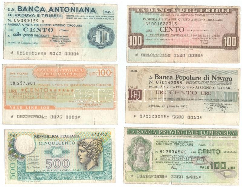 Olaszország 1974. 500L + 1976-1977. 5db csekk, mind különféle kiadás, 100L értékben T:III,III-