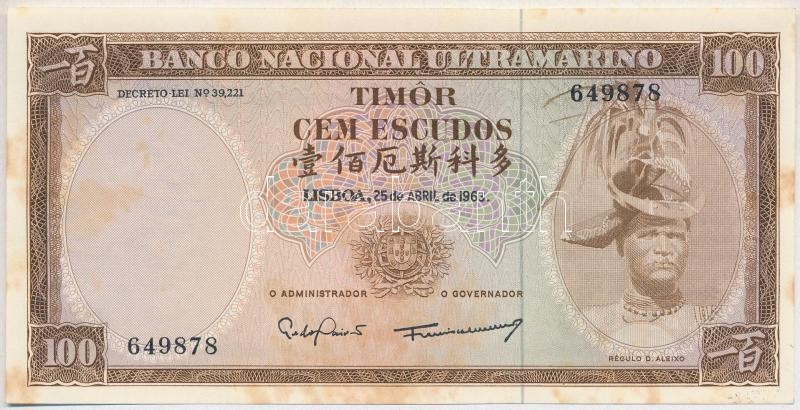 Timor / Portug... https://www.darabanth.com/hu/358-Gyorsarveres/358.0/Numizmatika/Kulfoldi-bankjegyek~2000012/Timor-portugal-kozigazgatas-1963-100Esc-TI-foltos-Timor-Portugese-colony-1963-100-Escudo~II2055923