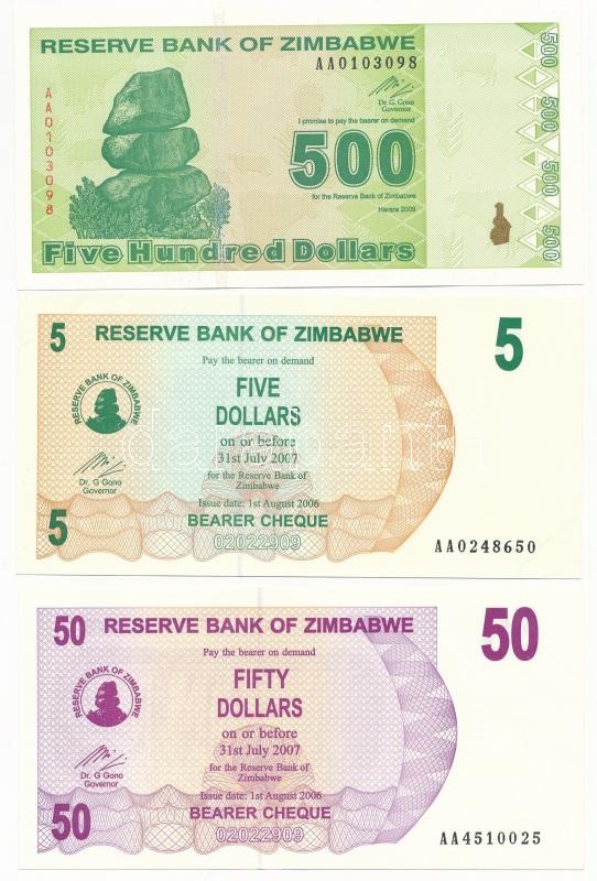 Zimbabwe 2006. 5 Dollars + 10 Dollars + 2009. 500 Dollars C:UNC