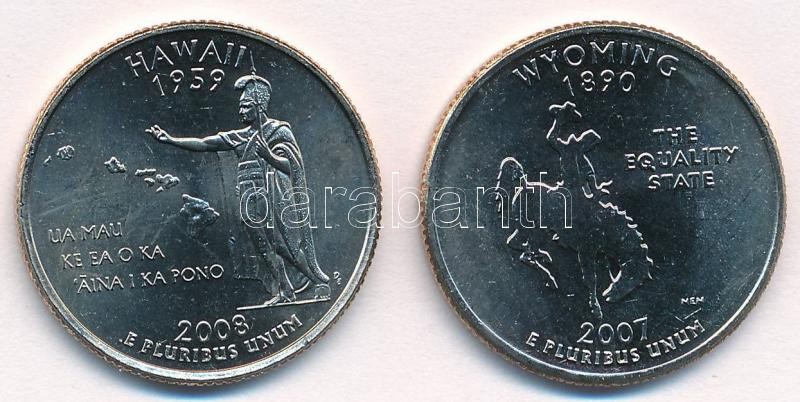 Amerikai Egyesült Államok 2007P 1/4$ "50 állam - Wyoming" Cu-Ni + 2008P 1/4$ "50 állam - Hawaii" Cu-Ni tanúsítvánnyal T:1 USA 2007P 1/4 Dollar "50 States - Wyoming" Cu-Ni + 2008P 1/4 Dollar "50 States - Hawaii" Cu-Ni with certificate C:UNC