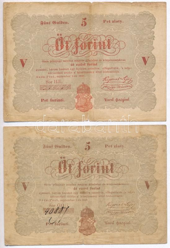Leírás: 1848. 5Ft "Kossuth bankó" vörösesbarna + 1848. 5Ft "Kossuth bankó" barna nyomat T:III,III-